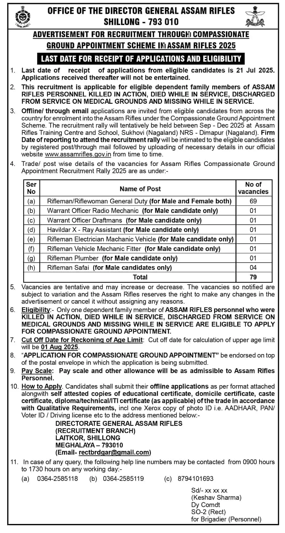 - DIRECTORATE GENERAL ASSAM RIFLES (RECRUITMENT BRANCH) LAITKOR, SHILLONG MEGHALAYA – 793010 (Email: rectbraggas@gmail.com)
